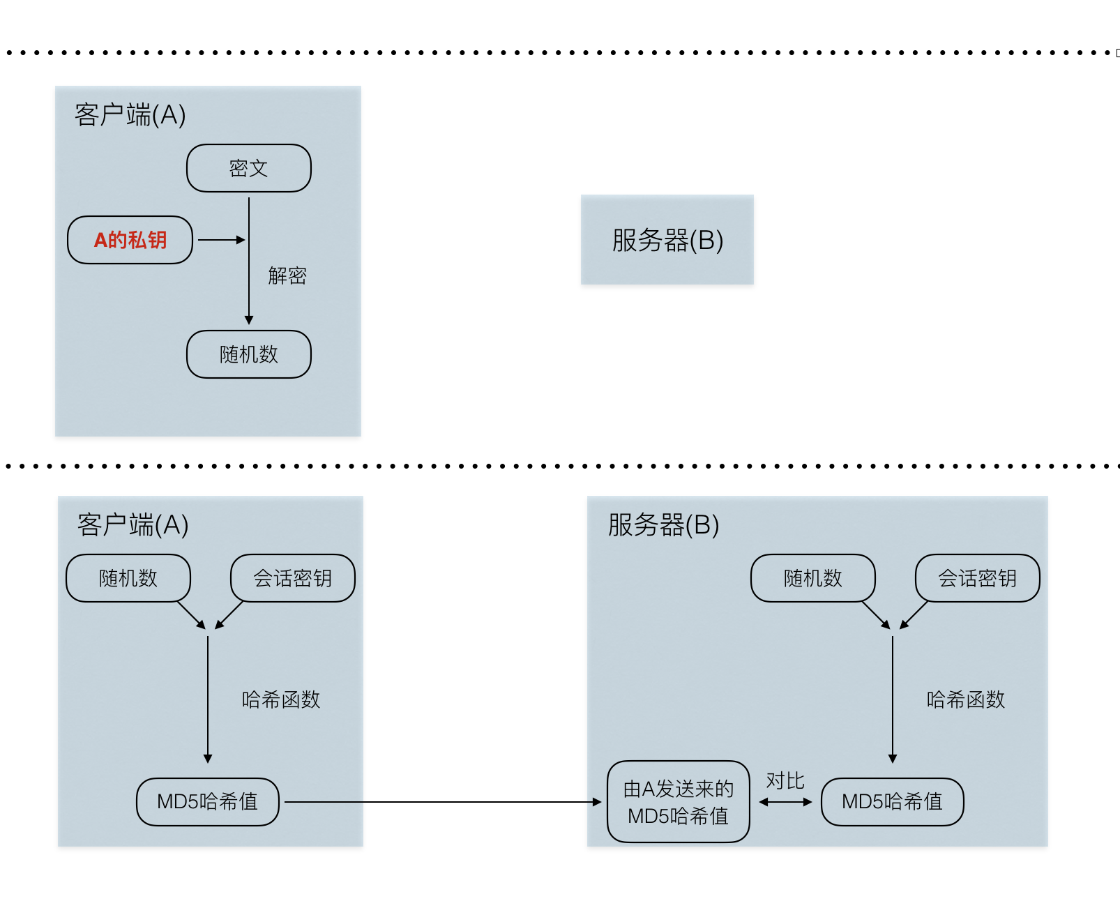 - 客户端将得到的随机数与加密会话所使用的会话密钥间拼接在一起后,计算出其MD5哈希值。