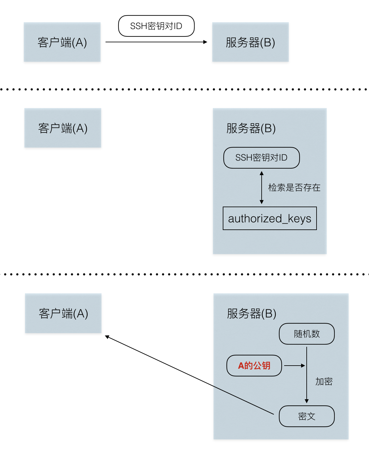 authorized_keys文件中进行检索 - 假设服务器在文件找到了符合密钥对ID的公钥,服务器将生成一个随机数,并用这个公钥进行加密。